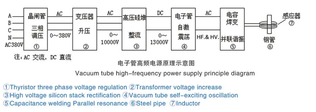 Normal endüstriyel AC (Çin'de üç fazlı dört telli 380V/50HZ), tristör AC voltaj regülatörü aracılığıyla 0 ila 380V (frekans değişmeden) arasında değişen ayarlanabilir AC'ye dönüştürülür ve daha sonra bir transformatör tarafından yaklaşık 10000V yüksek voltaja (frekans değişmeden) yükseltilir ve daha sonra yüksek voltajlı bir doğrultucu devresi ile onbinlerce yüksek voltaj DC'ye düzeltilir ve ardından vakum tüpü ile HF ve HV'ye salınır akım ve daha sonra salınım akımını yükseltmek için LC paralel rezonans yoluyla ve çelik boruların ve diğer iş parçalarının vb. ısıtılması için kullanılan indüktöre voltaj azaltıldıktan sonra besleme yapılır.