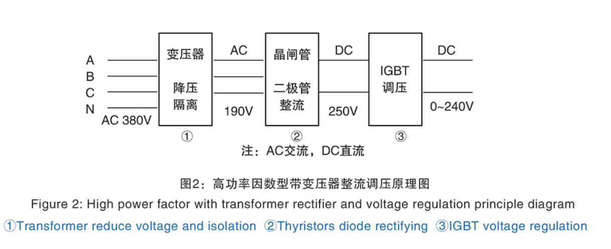 1. Voltaj regülasyonunu düzelterek sınıflandırılır: Eş zamanlı düzeltme ve voltaj regülasyonunu tamamlamak için tristörler (SCR) kullanılabilir veya önce doğrultucu diyot veya tristörler kullanılabilir ve ardından IGBT regülasyon voltajı kullanılabilir. IGBT regüle voltajını kullanın, ekipman faktörünü iyileştirmek içindir. Elektrikten tasarruf edebilir ve kaynak kalitesini daha da artırabilir.